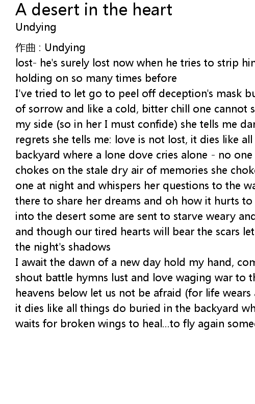 | I' ve tried to let go to peel off deception' s mask but hid my fears behind walls of sorrow and like a cold, bitter chill one cannot shake disillusionment sits by my side so in her I must confide she tells me dark secrets and grim tales of regrets she tells me: love is not lost, it dies like all things do buried in the backyard where a lone dove cries alone no one to share her days with she chokes on the stale dry air of memories she chokes on the words she says to no one at night and whispers her questions to the walls and drifts to sleep no one there to share her dreams and oh how it hurts to see tears fall from her eyes into the desert some are sent to starve weary and weak they make their way home and though our tired hearts will bear the scars let us find who we are buried in the night' s shadows | |