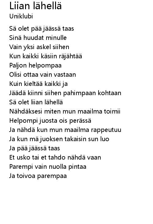 | Song | Liian lähellä |