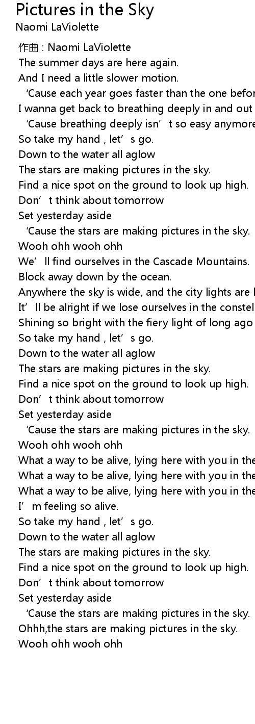 | [02:17.689] | ' Cause the stars are making pictures in the sky. |