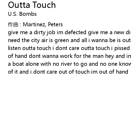 | give me a dirty job im defected give me a new disease so infected all the smog i need the city air is green and all i wanna be is out of it outta touch i dont listen outta touch i dont care outta touch i pissed it away outta touch im out of hand dont wanna work for the man hey and im dont with the corner mna eh im on a boat alone with no river to go and no one knows ' cause the raft is gone im out of it and i dont care out of touch im out of hand |