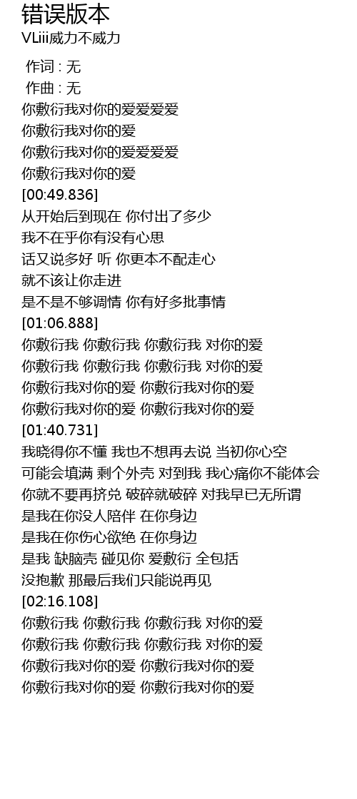 | [02:16.359] | 你敷衍我 你敷衍我 你敷衍我 对你的爱 |