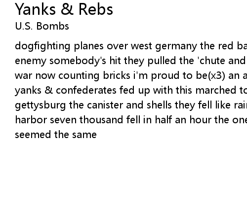 | dogfighting planes over west germany the red baron'll say that you ain't his enemy somebody's hit they pulled the 'chute and the jumped ship a prisoner of war now counting bricks i'm proud to be(x3) an american one two three four(x2) yanks & confederates fed up with this marched to the trenches in the woods of gettysburg the canister and shells they fell like rain marched onward to cold harbor seven thousand fell in half an hour the one's that made it home never seemed the same |