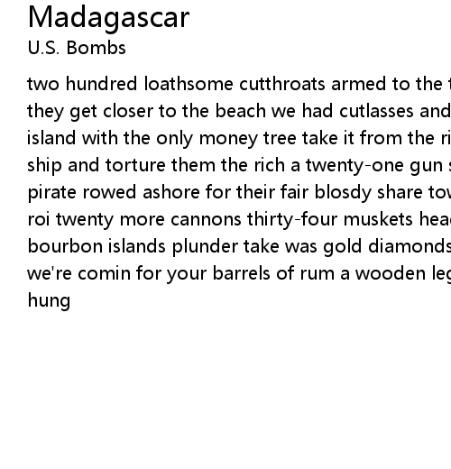 two hundred loathsome cutthroats armed to the teeth hurling there grenades as they get closer to the beach we had cutlasses and blunderbusses off to get an island with the only money tree take it from the rich bless the pirates jump the ship and torture them the rich a twenty-one gun salute and three loud cheers pirate rowed ashore for their fair blosdy share town croud shouted out viva le roi twenty more cannons thirty-four muskets headed out for treasure in the bourbon islands plunder take was gold diamonds silks an porcelains madagascar we're comin for your barrels of rum a wooden leg i stand on by ye gallows we hung |