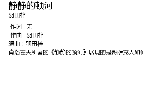 | [00:22.22] | 肖洛霍夫所著的《静静的顿河》展现的是哥萨克人如何通过战争、痛苦和流血,走向社会主义,是一部描写具有重大历史意义时代的人民生活史诗。 |