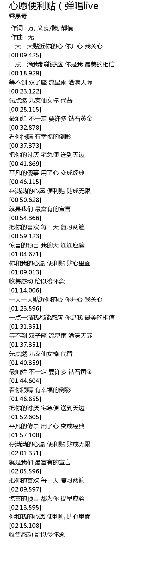 | [01:06.502] | 你和我的心愿 便利贴 贴心里面 |