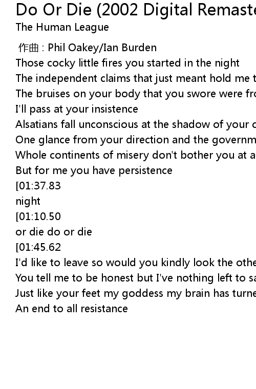 | [01:02.65][01:10.50][01:41.72][01:49.54][04:33.84][04:41.64][04:49.45][04:57.31][05:05.12][05:12.92] | Do or die do or die |