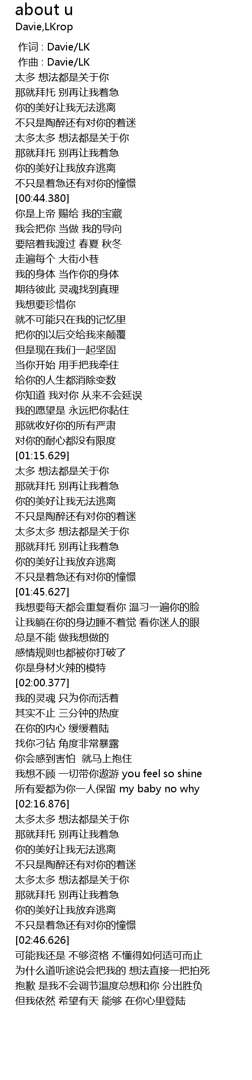 | [02:32.376] | 太多太多 想法都是关于你 |