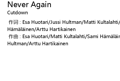 [00:00.00-1] 作词 : Esa Huotari/Jussi Hultman/Matti Kultalahti/Sami Hämäläinen/Arttu Hartikainen