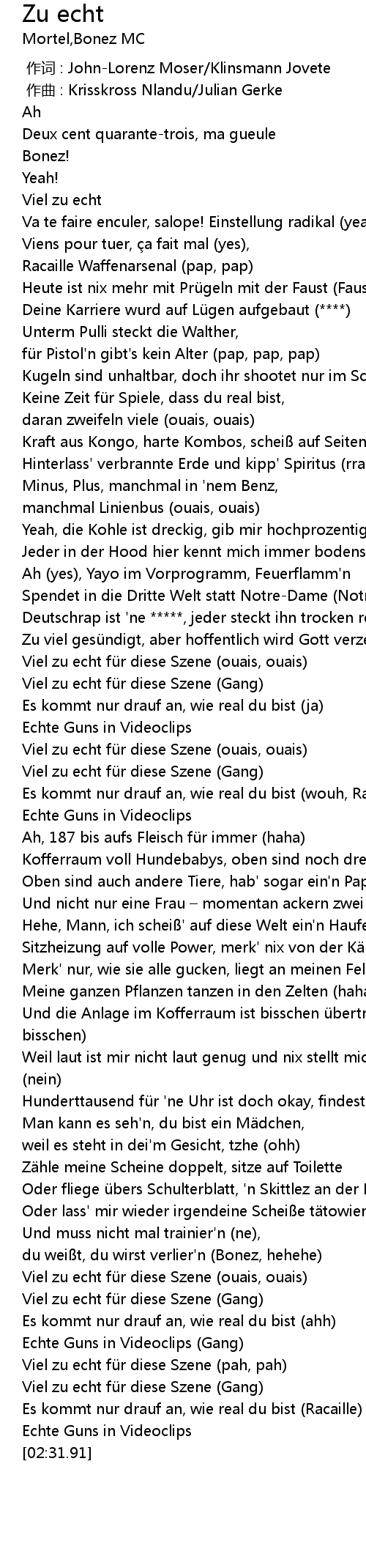 | [02:26.41] | Es kommt nur drauf an, wie real du bist (Racaille) |
