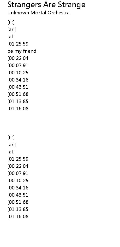 | [01:23.25][01:25.59][00:19.70][00:17.52][01:09.16][00:03.60][01:07.18][00:01.27] |