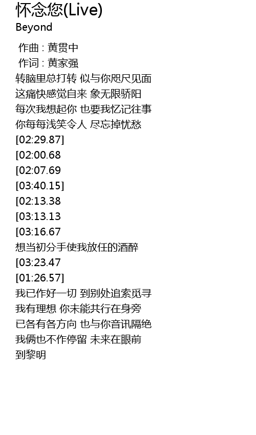 | [03:09.59][02:13.38][01:10.12] | 怀念你 到黎明 |