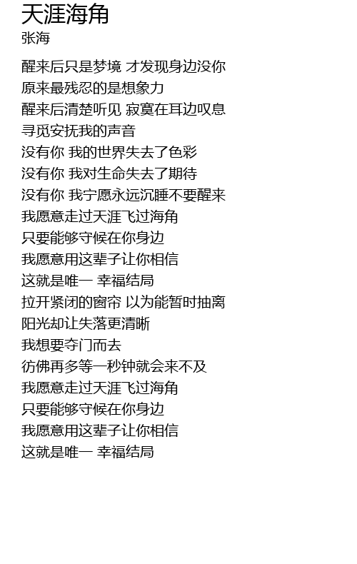 | [00:48.48] | wǒ yuàn yì zǒu guò tiān yá fēi guò hǎi jiǎo |