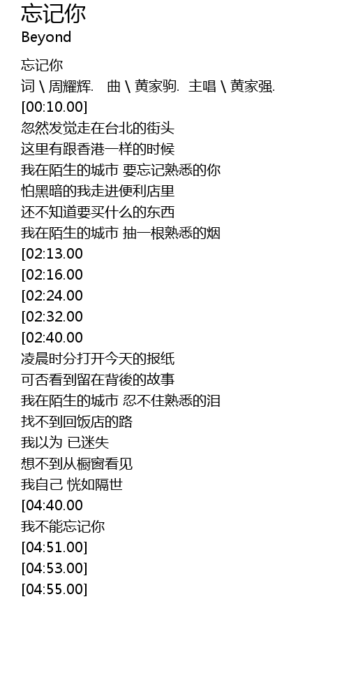 | [04:44.00][04:40.00][04:36.00][04:32.00][04:28.00][04:24.00][04:20.00] | 忘记你 |