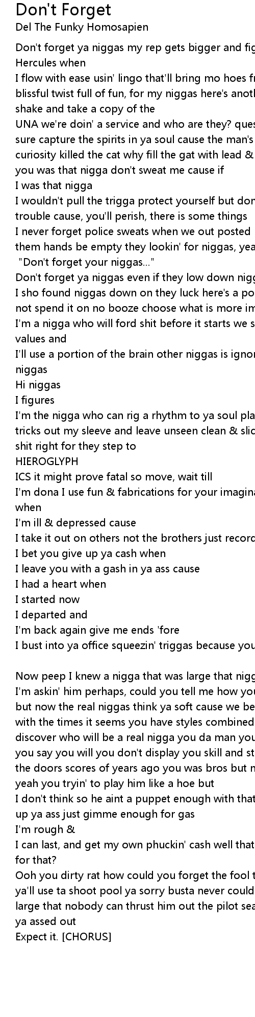 I never forget police sweats when we out posted like marionettes we jets, unless them hands be empty they lookin' for niggas, yeah they not allowed to peel me. [CHORUS:] "Don't forget your niggas..." |