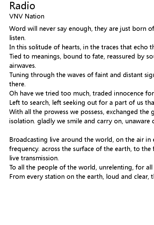 | Tied to meanings, bound to fate, reassured by sounds that echo across the airwaves. | |