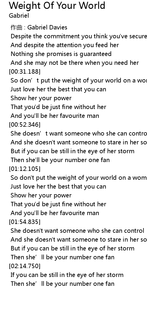 | [00:31.385] | So don' t put the weight of your world on a woman |