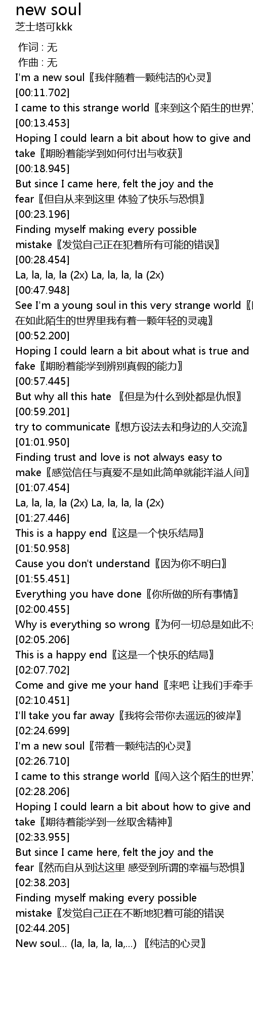 | [00:09.447] | I'm a new soul〖我伴随着一颗纯洁的心灵〗 |