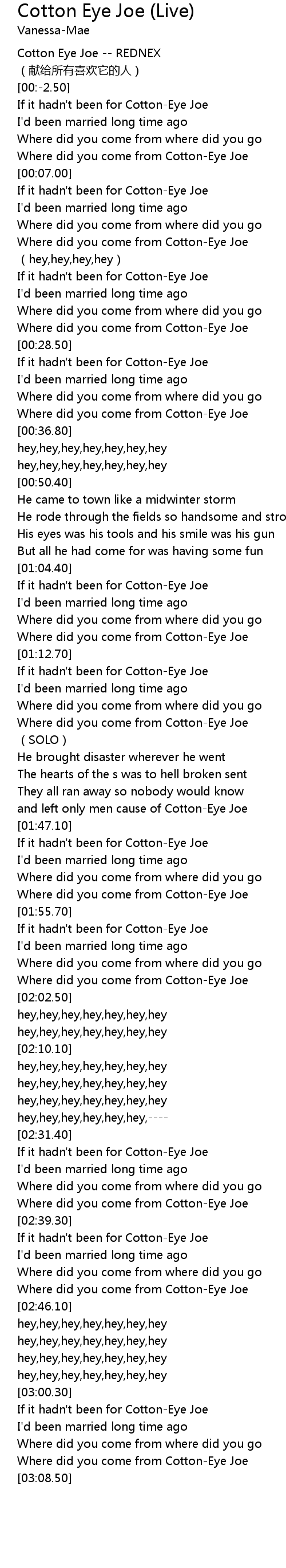 | [00:34.90] | Where did you come from Cotton-Eye Joe |