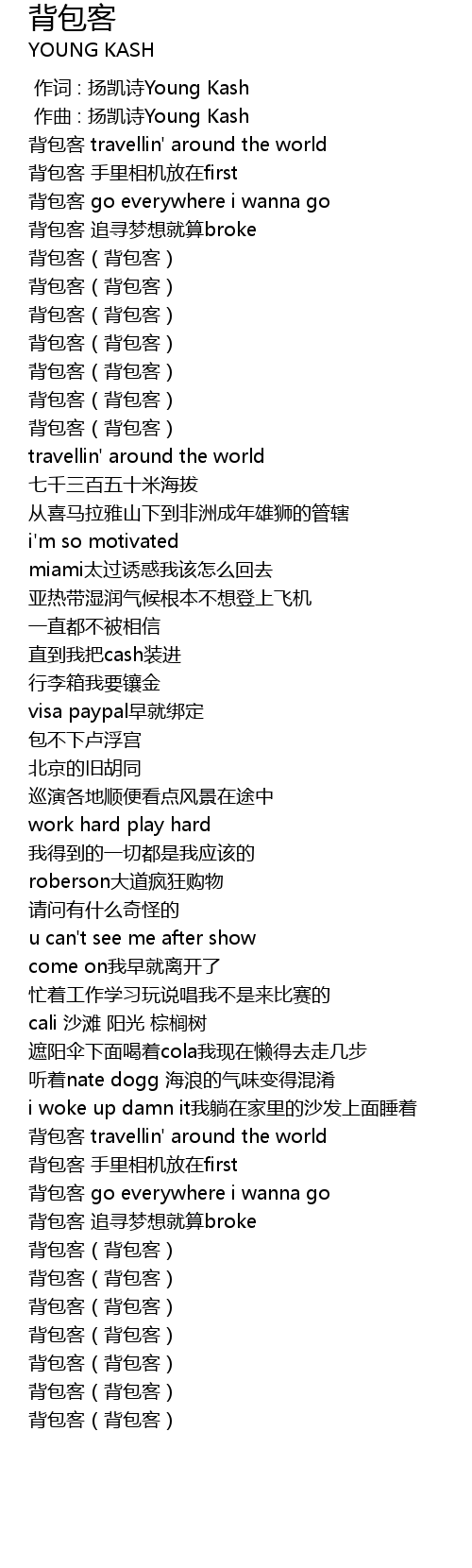 | [00:11.416] | bēi bāo kè travellin' around the world |