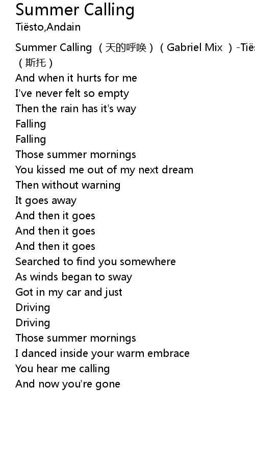| [00:00.00] | Summer Calling (天的呼唤)(Gabriel Mix )-Tiësto (斯托) |