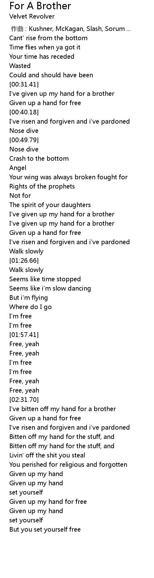 | [00:32.04] | I've given up my hand for a brother |