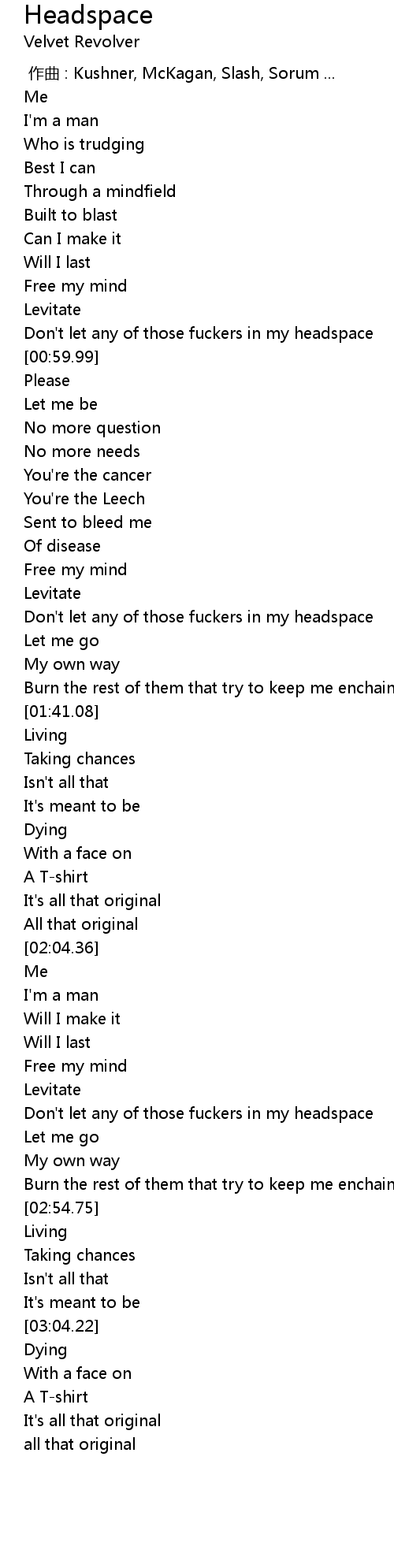 | [01:25.67] | Don't let any of those fuckers in my headspace |