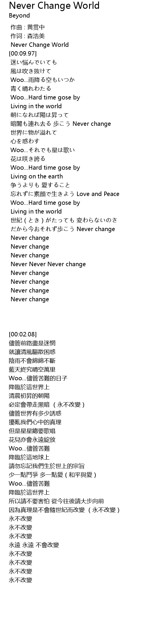 | [00:02.08] | Never Change World |