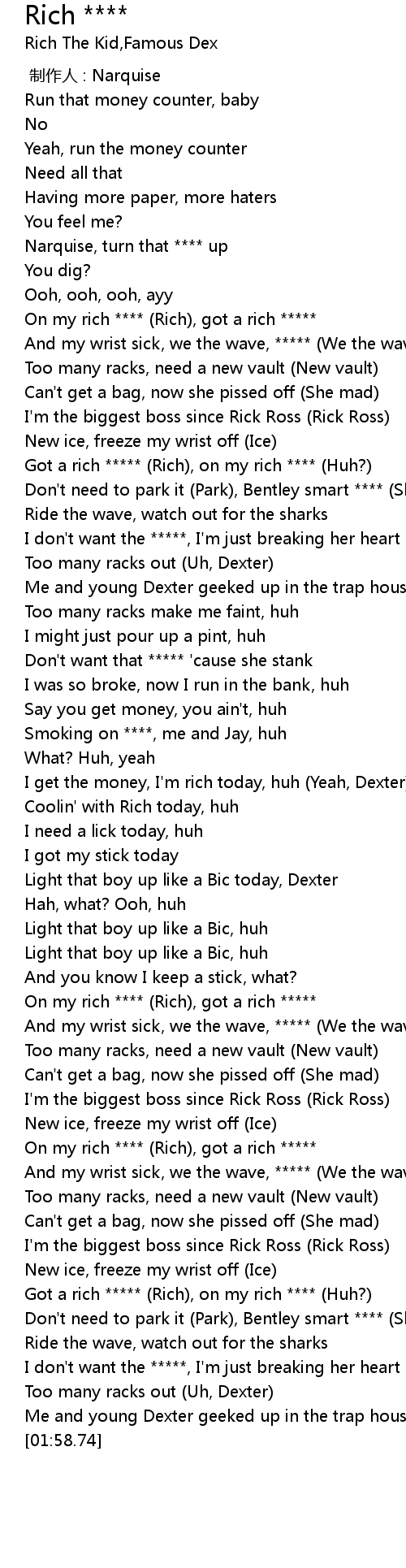 | [00:19.85] | On my rich **** (Rich), got a rich ***** |