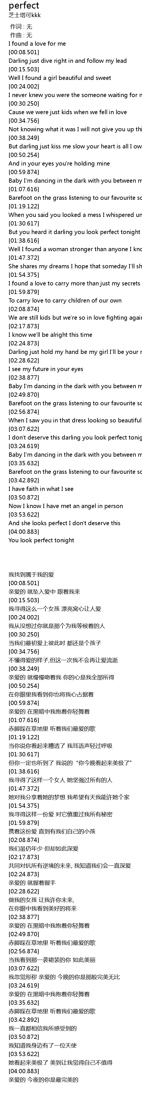 | [03:08.121] | I don' t deserve this darling you look perfect tonight |