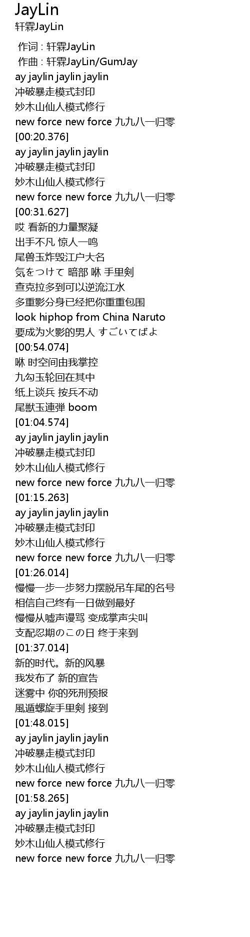 | [01:56.015] | new force new force jiu jiu ba yi gui ling |