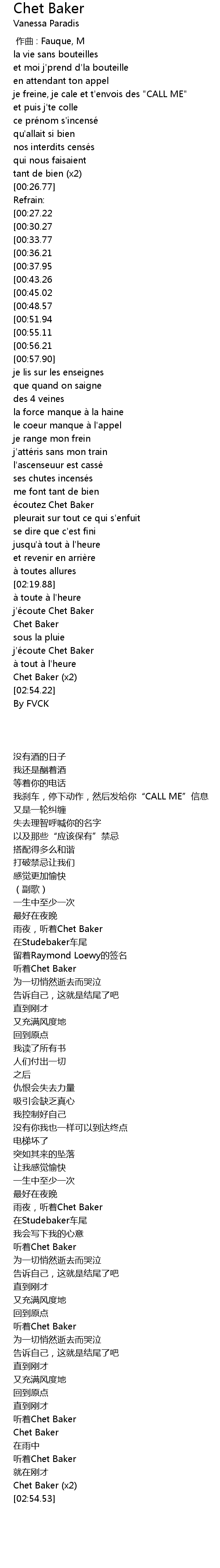 | [01:49.83][00:43.26] | écoutez Chet Baker |