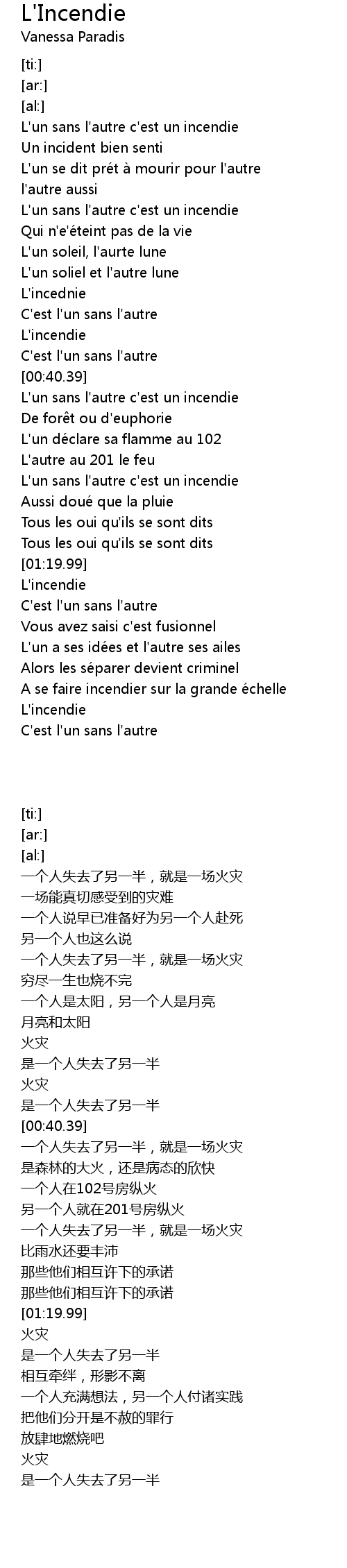 | [00:15.98] | L'un sans l'autre c'est un incendie |