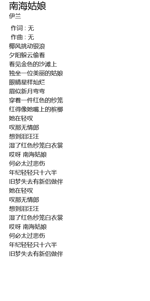 | [01:09.942] | āi yā nán hǎi gū niáng |