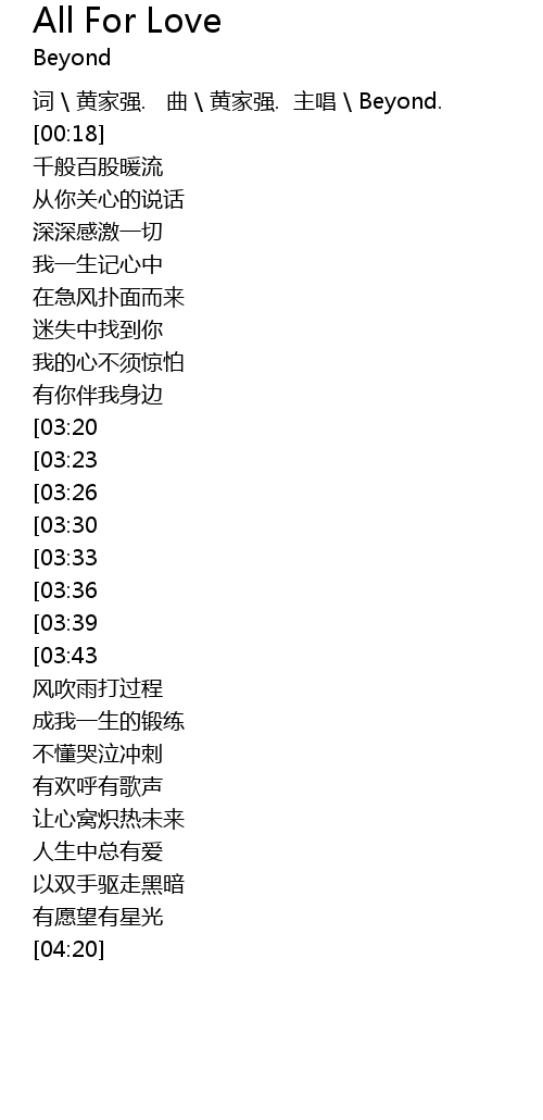 | [00:09] | 词 \ 黄家强. 曲 \ 黄家强. 主唱 \ Beyond. |
