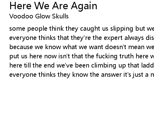 | some people think they caught us slipping but we all know that it's not true everyone thinks that they're the expert always dissin' us and our crew just because we know what we want doesn't mean we aren't true you're the ones that put us here now isn't that the fucking truth here we are again.... and we'll be here till the end we've been climbing up that ladder and haven't fallen yet everyone thinks they know the answer it's just a matter of opinion |