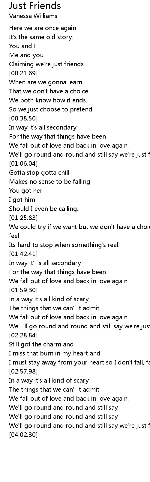 | [00:58.42] | We'll go round and round and still say we're just friends. |