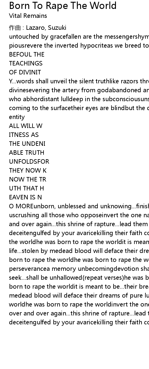 | O MOREunborn, unblessed and unknowing... finish the deed of those who came before uscrushing all those who opposeinvert the one nailed to woodbeing ravished over and over again... this shrine of rapture... lead them to this world of deceitengulfed by your avaricekilling their faith completelyhe was born to rape the worldhe was born to rape the worldit is meant to be... their breath of life... stolen by medead blood will deface their dreams of pure lucidityhe was born to rape the worldhe was born to rape the worldleft in awethe cessation of perseverancea memory unbecomingdevotion shall drown those who followthe god they seek... shall be unhallowed repeat verses he was born to rape the worldhe was born to rape the worldit is meant to be... their breath of life... stolen by medead blood will deface their dreams of pure lucidityhe was born to rape the worldhe was born to rape the worldinvert the one nailed to woodbeing ravished over and over again... this shrine of rapture... lead them to this world of deceitengulfed by your avaricekilling their faith completely |
