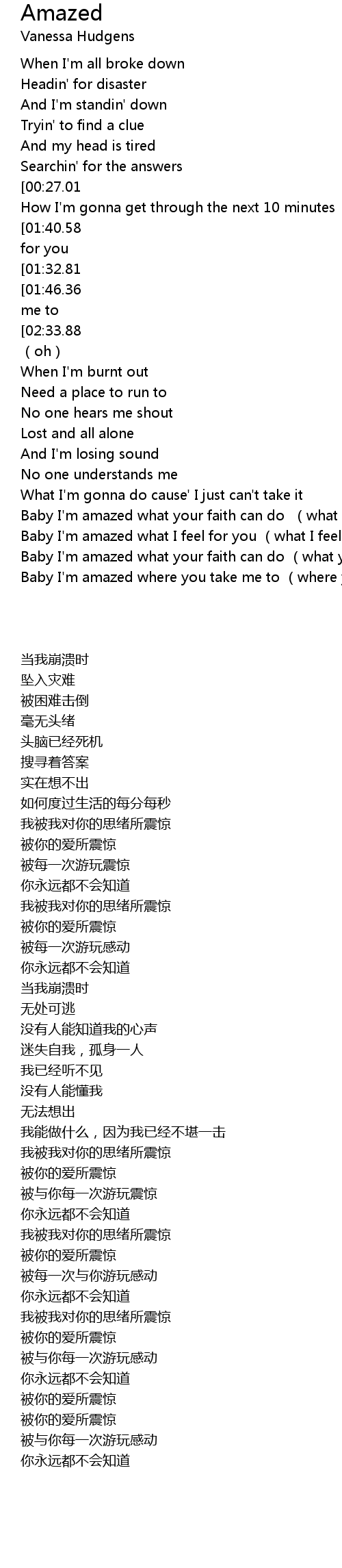 | [02:28.30][01:32.81][00:47.85][00:36.62] | Baby I' m amazed what your faith can do |