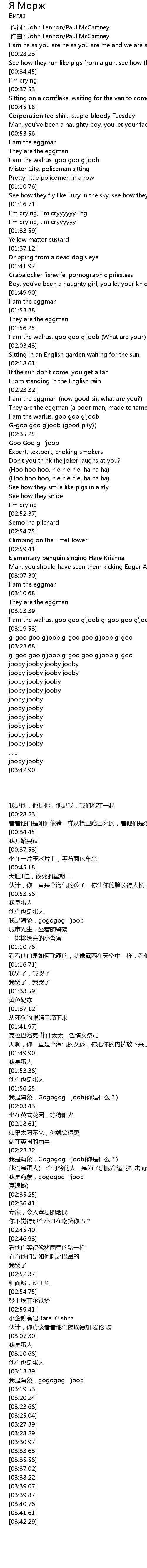| [01:56.93] | I am the walrus, goo goo g' joob What are you? |