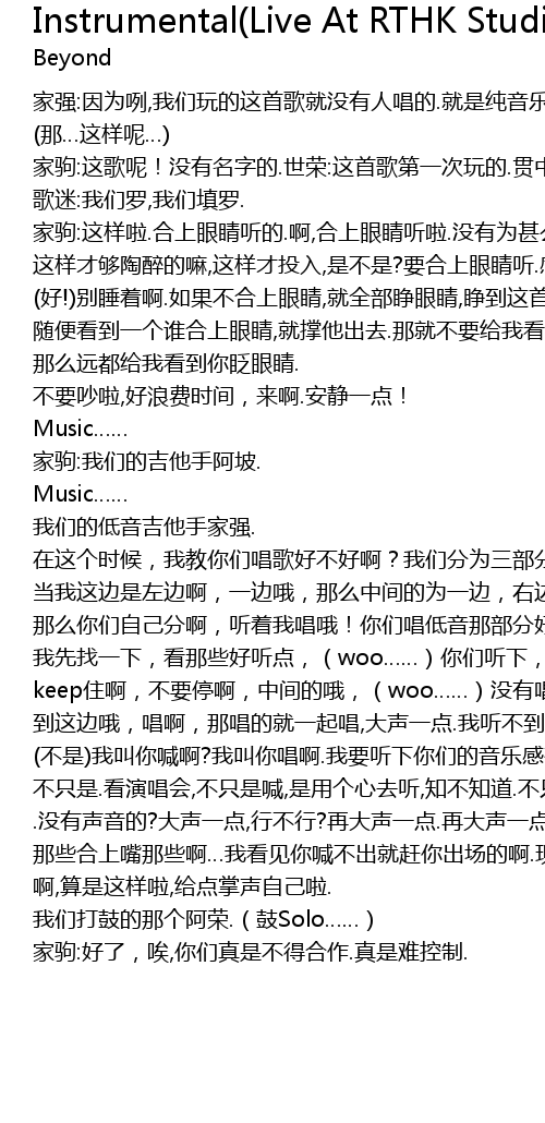 | [00:09] | 家驹:这歌呢!没有名字的.世荣:这首歌第一次玩的.贯中:因为找不到填词人的关系. |