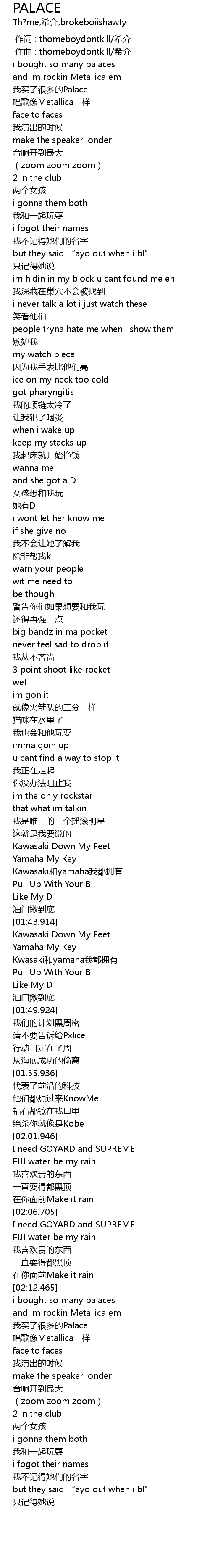 | [02:15.471] | wǒ mǎi le hěn duō de Palace |