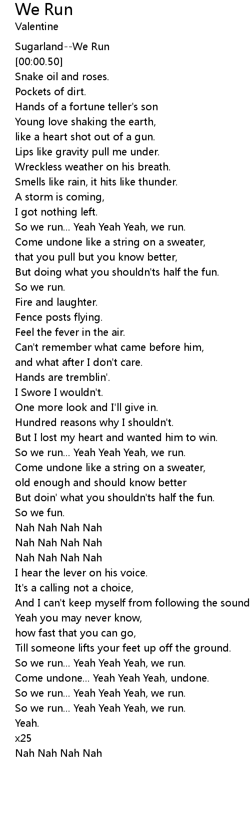 | [02:47.65] | So we run... Yeah Yeah Yeah, we run. |