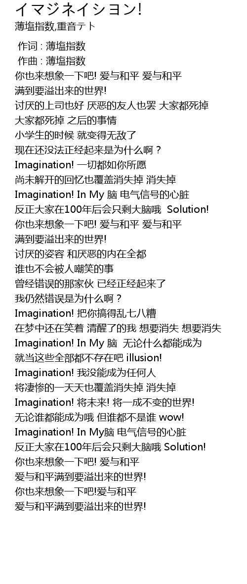 | [2:30.153] | Imagination! jiāng wèi lái! jiāng yī chéng bù biàn de shì jiè! |