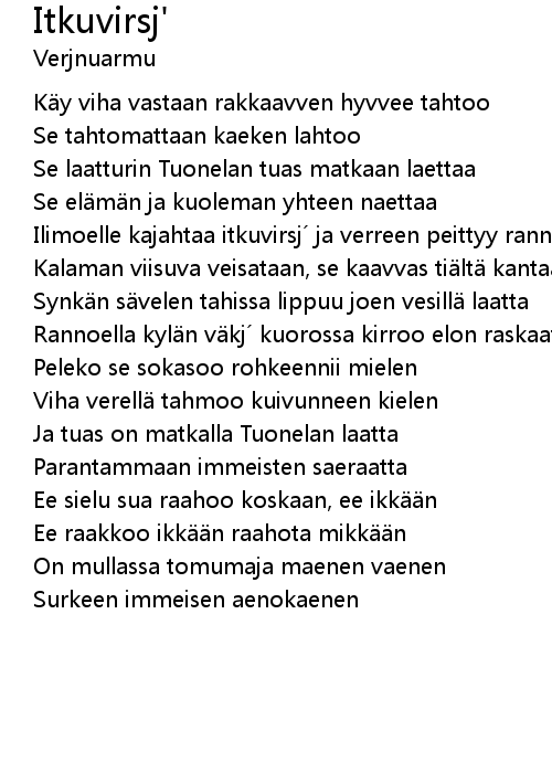 | Ilimoelle kajahtaa itkuvirsj ja verreen peittyy rannat | |