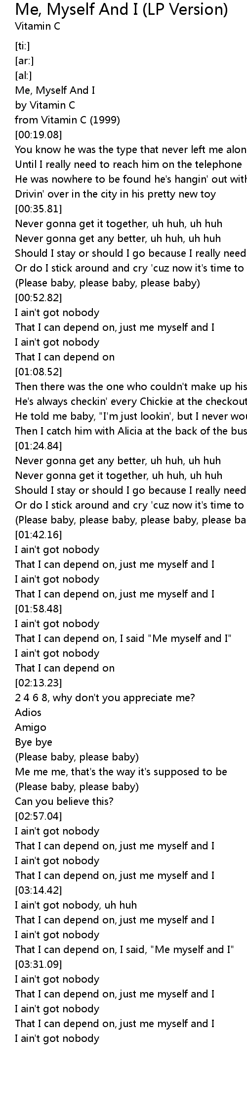 | [02:00.71] | That I can depend on, I said "Me myself and I" |