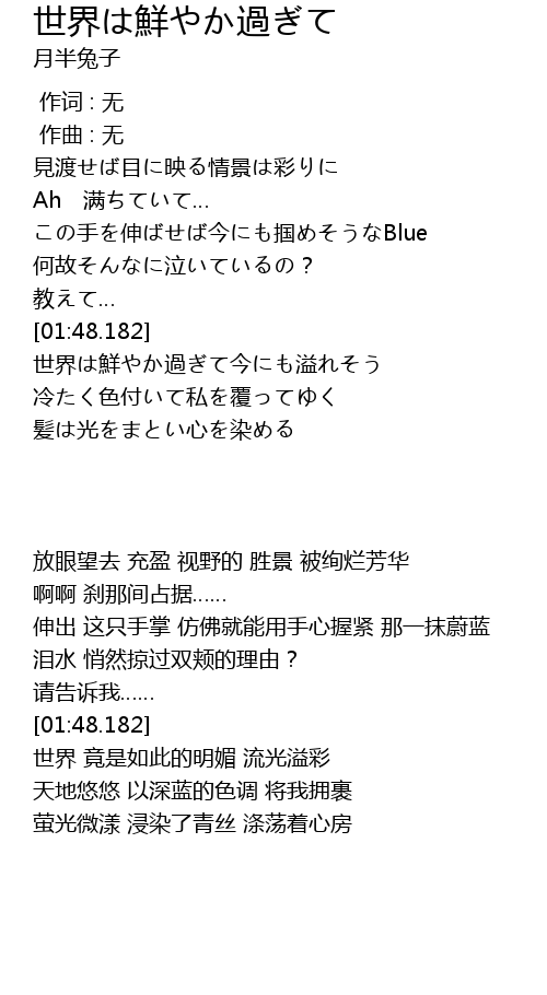 | [01:50.183] | 世界は鮮やか過ぎて今にも溢れそう |