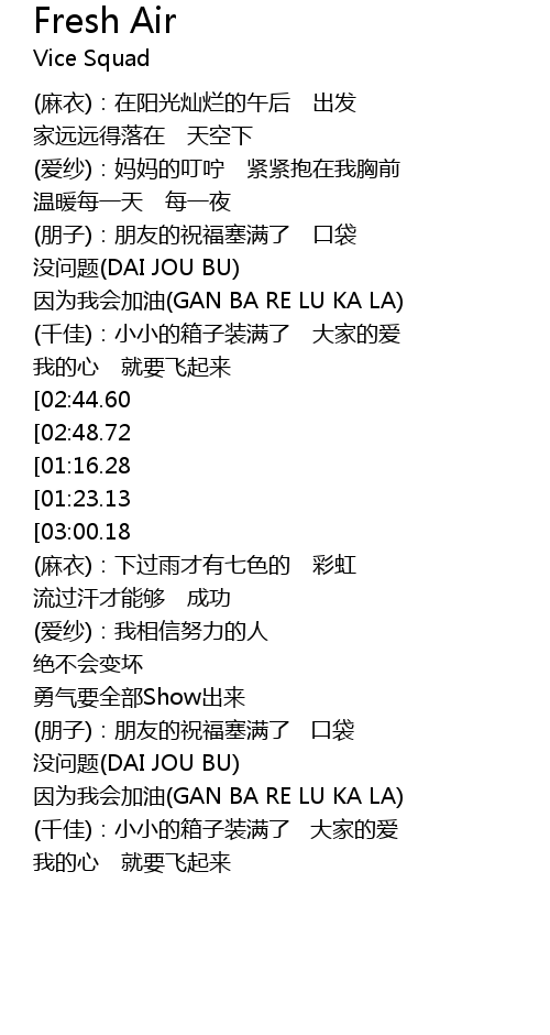 | [02:50.17][01:16.28] | ni hui kan jian wo zai tian kong ao xiang Fresh Fresh Fresh |