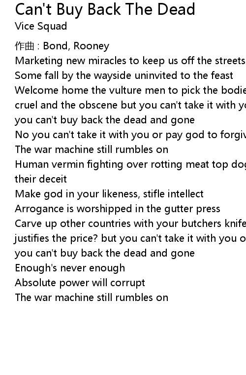 | Welcome home the vulture men to pick the bodies clean cover up and sanitise the cruel and the obscene but you can't take it with you or pay god to forgive you you can't buy back the dead and gone | |