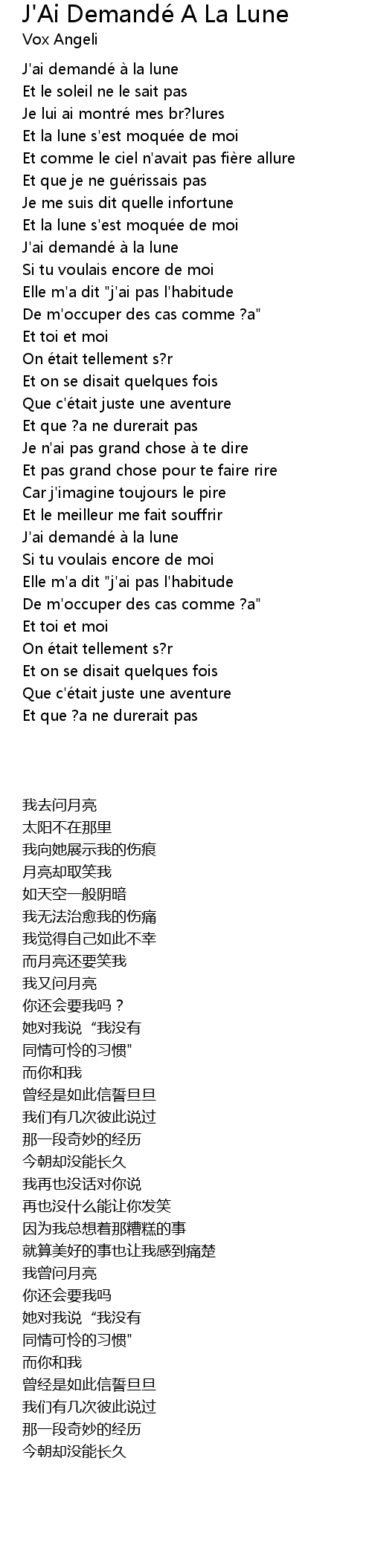 | [00:44.35] | Et la lune s' est moque e de moi |