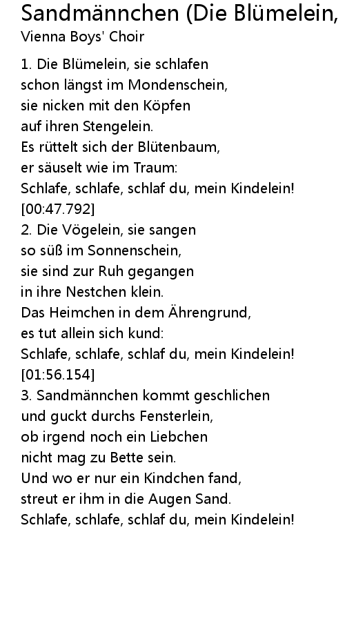 | Song | Sandmännchen (Die Blümelein, Sie Schlafen) |